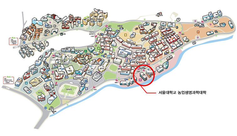 남부순환도로의 봉천사거리에서 관악구청 방향으로 직진하면 서울대 정문이 나옵니다. 정문 진입시 방문자용 주차권을 발급 받으시고 순환도로를 따라 약 1Km를 직진하면 우측에 농업생명과학대학건물이 있습니다.